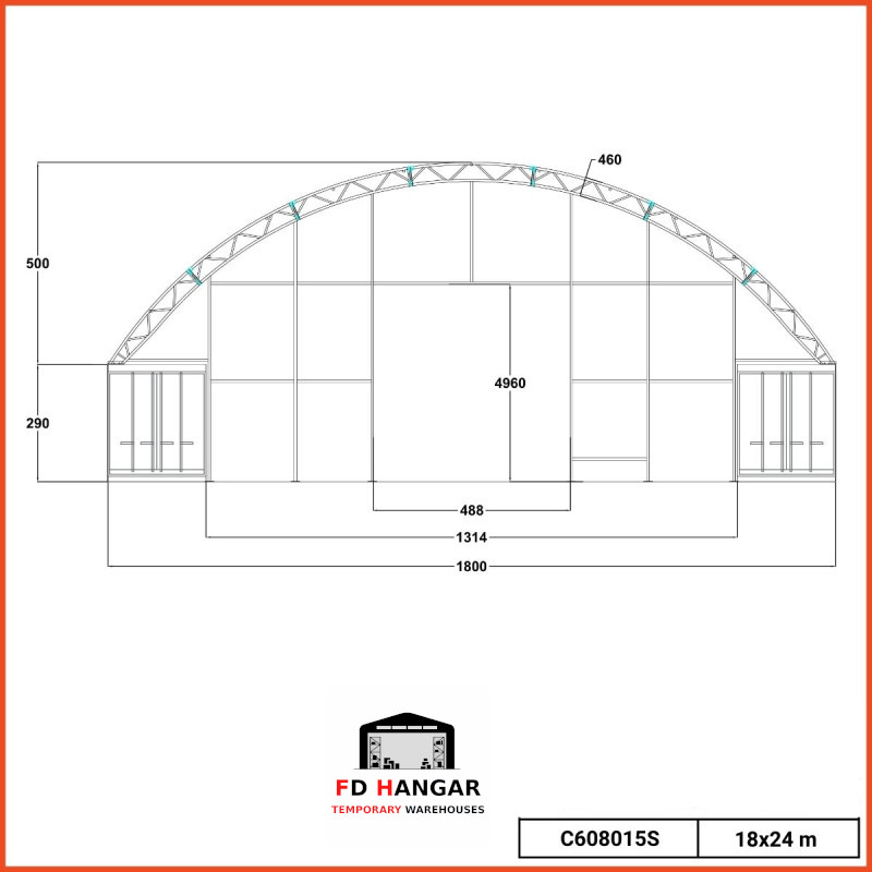 La copertura del container C608015S, larga 18 m e lunga 24 m, è realizzata in acciaio zincato di lunga durata, che garantisce la resistenza alla corrosione e un uso duraturo. La struttura in acciaio è ulteriormente rinforzata da puntoni diagonali nella prima e nell'ultima coppia di archi strutturali. La copertura del container è realizzata con uno spesso tessuto in PVC del peso di 750 g/m², che offre un'eccellente protezione dall'acqua e dai raggi UV.