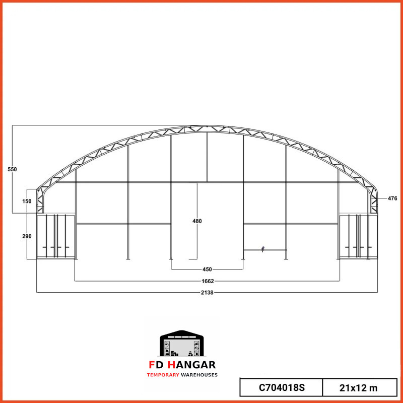 La copertura del container GSC704018C, larga 21 m e lunga 12 m, è realizzata in acciaio zincato per impieghi gravosi, per garantire la resistenza alla corrosione e un uso duraturo. La struttura in acciaio è ulteriormente rinforzata da puntoni diagonali nella prima e nell'ultima coppia di archi strutturali. Il tetto della copertura del container è realizzato con uno spesso tessuto in PVC del peso di 750 g/m², che offre un'eccellente protezione dall'acqua e dai raggi UV.