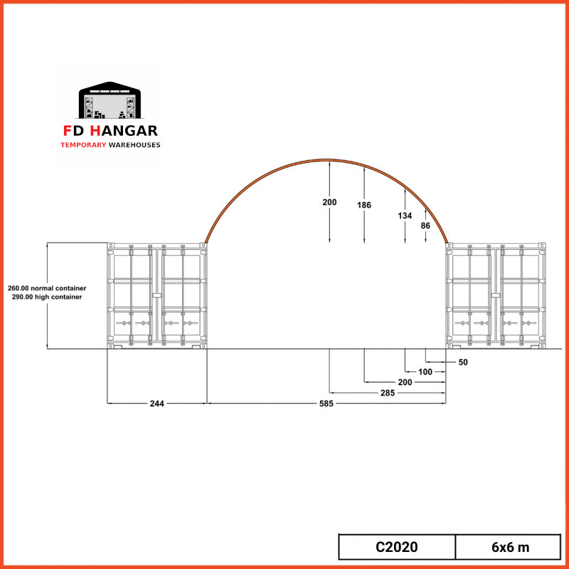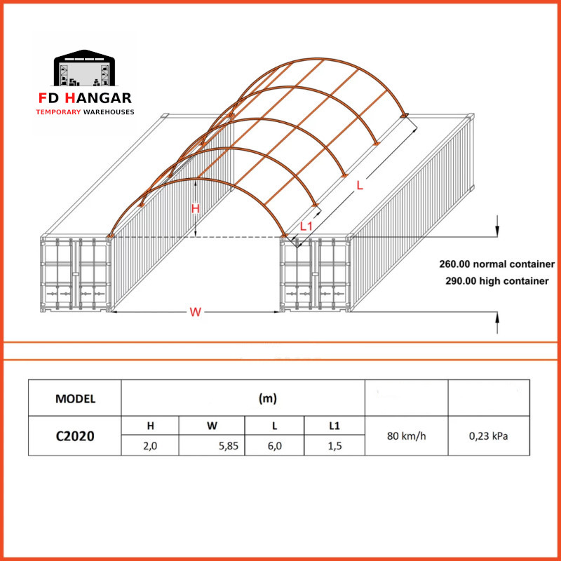Pensilina per container C2020H 6×6 m con parete posteriore