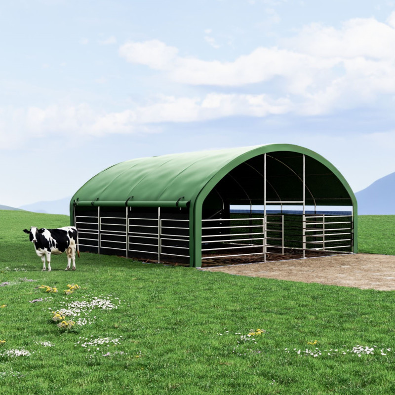 Uno degli elementi chiave del recinto per mucche/cavalli è il ** telone in robusto PVC da 900 g/m². Questo lo rende resistente ai raggi UV, alla pioggia, alla neve e al vento. Questo telone garantisce una protezione completa degli animali dalle condizioni atmosferiche avverse, rendendo il recinto ideale per tutto l'anno. Il materiale è anche molto resistente, il che si traduce in un uso duraturo senza bisogno di frequenti riparazioni o sostituzioni. Il telone spesso è molto più resistente agli strappi e alle abrasioni.