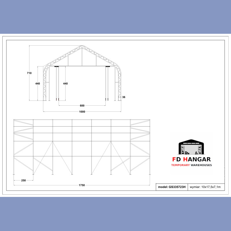 Il vantaggio principale del tendone della serie GS33, largo 10 m, è la sua struttura robusta. Il traliccio in acciaio è realizzato in acciaio zincato, che lo rende resistente alla corrosione per molti anni. La struttura a traliccio è molto più robusta di quelle a tubi singoli. Ulteriori rinforzi in corda e tubi d'acciaio rinforzano l'intera struttura della tenda di stoccaggio, rendendola ancora più resistente alle condizioni atmosferiche come vento, pioggia o neve. Il telone in PVC da 900 g/mq che utilizziamo è il tessuto più resistente disponibile sul mercato. È molto più resistente all'abrasione, al vento e ai raggi UV rispetto ai prodotti della concorrenza.