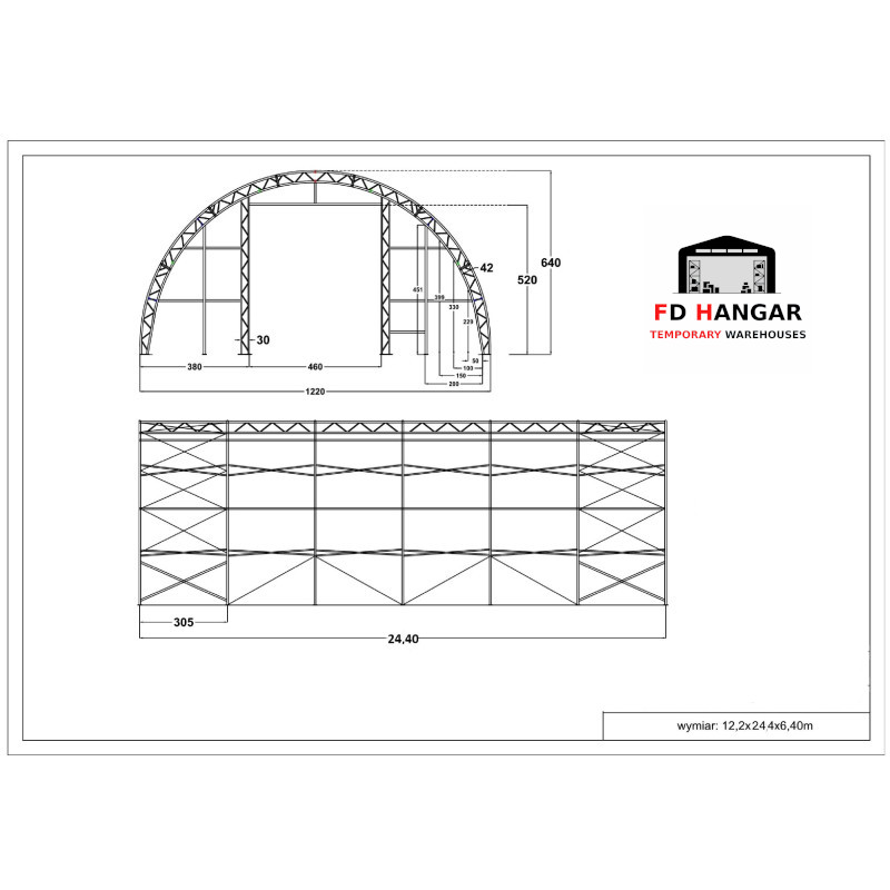 La struttura del padiglione è stata realizzata con acciaio S235 di altissima qualità, che garantisce un'adeguata rigidità e resistenza della struttura. Nel progetto è stata inclusa una controventatura aggiuntiva della corda inferiore della capriata, che rafforza l'intera struttura e ne aumenta la resistenza ai fattori esterni. La sala è sostenuta da collegamenti articolati al terreno stabile, utilizzando quattro ancoraggi, che garantiscono la stabilità dell'insieme anche in condizioni di terreno più difficili. La costruzione del padiglione è adattata alle condizioni climatiche polacche e soddisfa i requisiti della norma **PN-EN 13782:2015-07**, relativa alla sicurezza delle strutture temporanee come le tende, e delle norme **PN-EN 1991-1-3:2008** (per i carichi di neve) e **PN-EN 1991-1-4:2008** (per i carichi di vento).