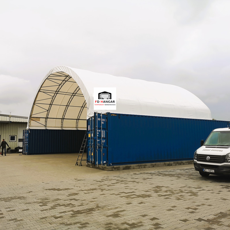 La parte portante è in acciaio zincato a caldo e resistente alla corrosione. La struttura a doppia capriata garantisce un'elevata rigidità e stabilità al vento. La tettoia è progettata per funzionare con venti fino a 80 km/h. Il telo in PVC da 900 g/m² è impermeabile, con una maggiore resistenza al fuoco e ai raggi UV. Il sistema di tensione riduce i ristagni d'acqua e mantiene la copertura tesa tutto l'anno. È una tecnologia collaudata per l'uso tutto l'anno in ambienti industriali.